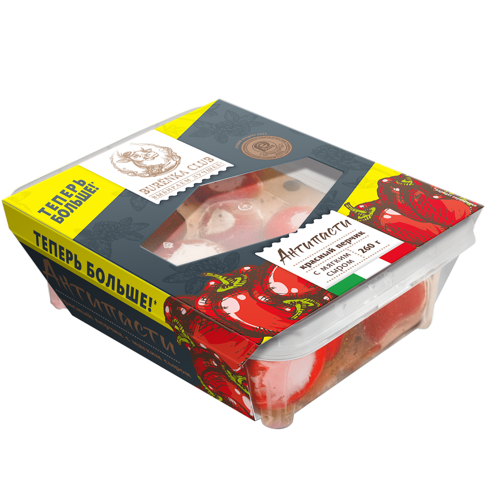 В антипасти BURЁNKA CLUB в качестве наполнителя используется сливочный сыр, который готовится по традиционной итальянской рецептуре, имеет жирность 70% и нежный сливочный вкус. Красный перчик BURЁNKA CLUB - имеет оригинальную круглую форму, сочную мякоть, насыщенный вкус.