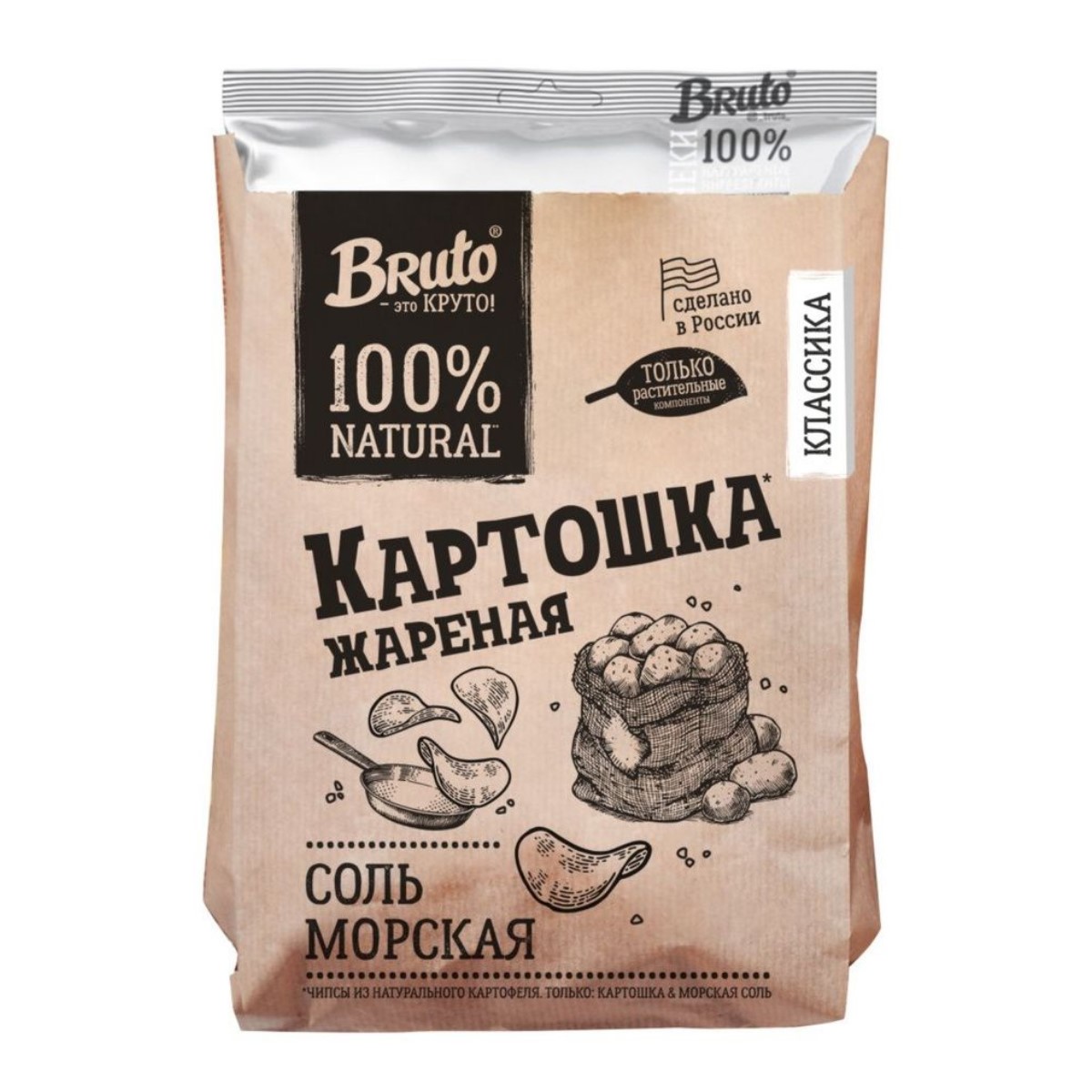 Картофельные чипсы BRUTO – это обжаренные в масле кусочки картофеля с добавлением соли. Яркий, насыщенный вкус без консервантов и красителей. Чипсы продаются в экологичной упаковке из крафтовой бумаги.