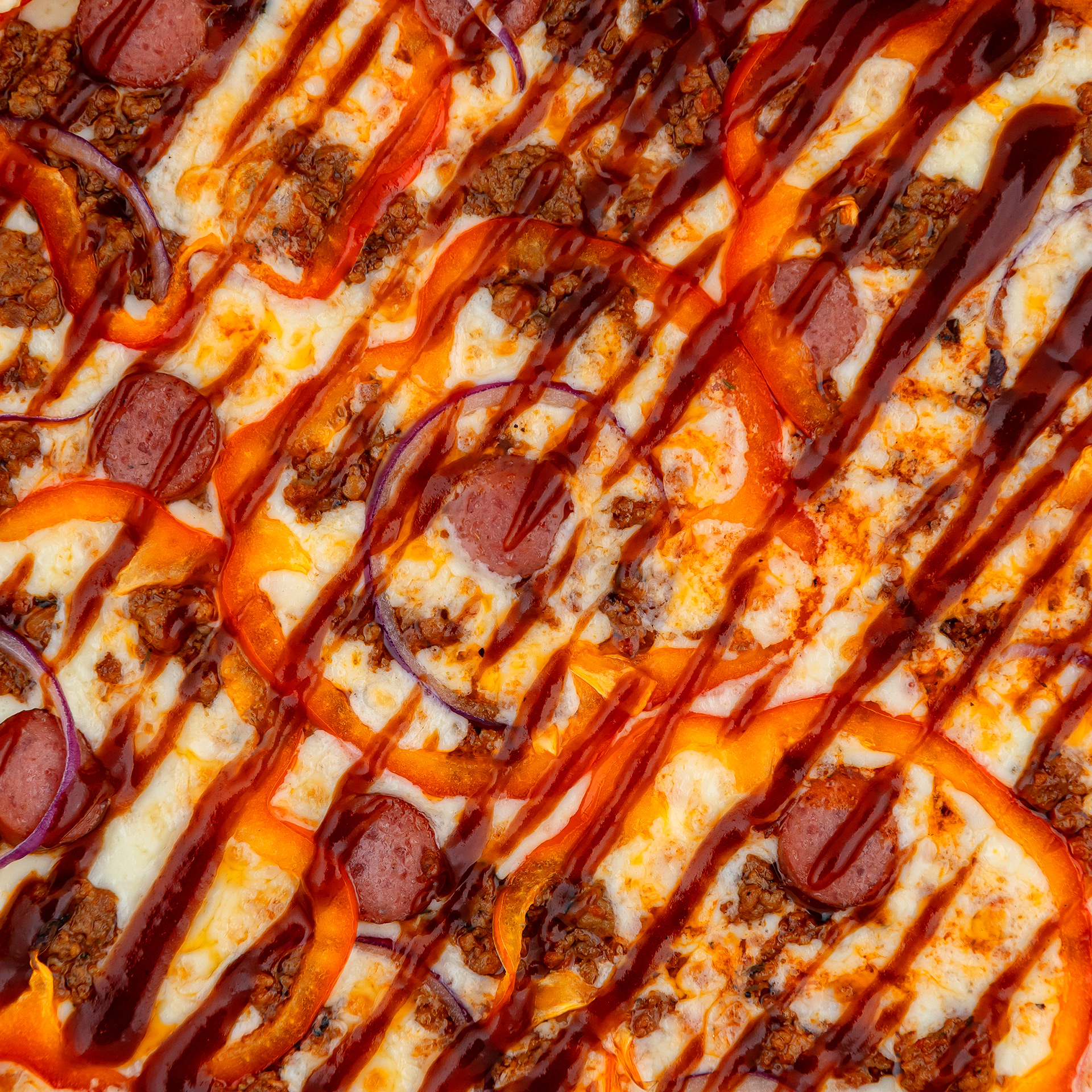 Тесто (мука, дрожжий, соль, сахар, вода, масло оливковое), томатный соус (томаты, соль, сахар, орегано, базилик, белый перец, масло оливковое), моцарелла, фарш болоньез (говядина, сельдерей, морковь, лук репчатый, томаты, тимьян, розмарин), колбаски охотничьи, помидор, лук красный, перец сладкий, соус барбекю.