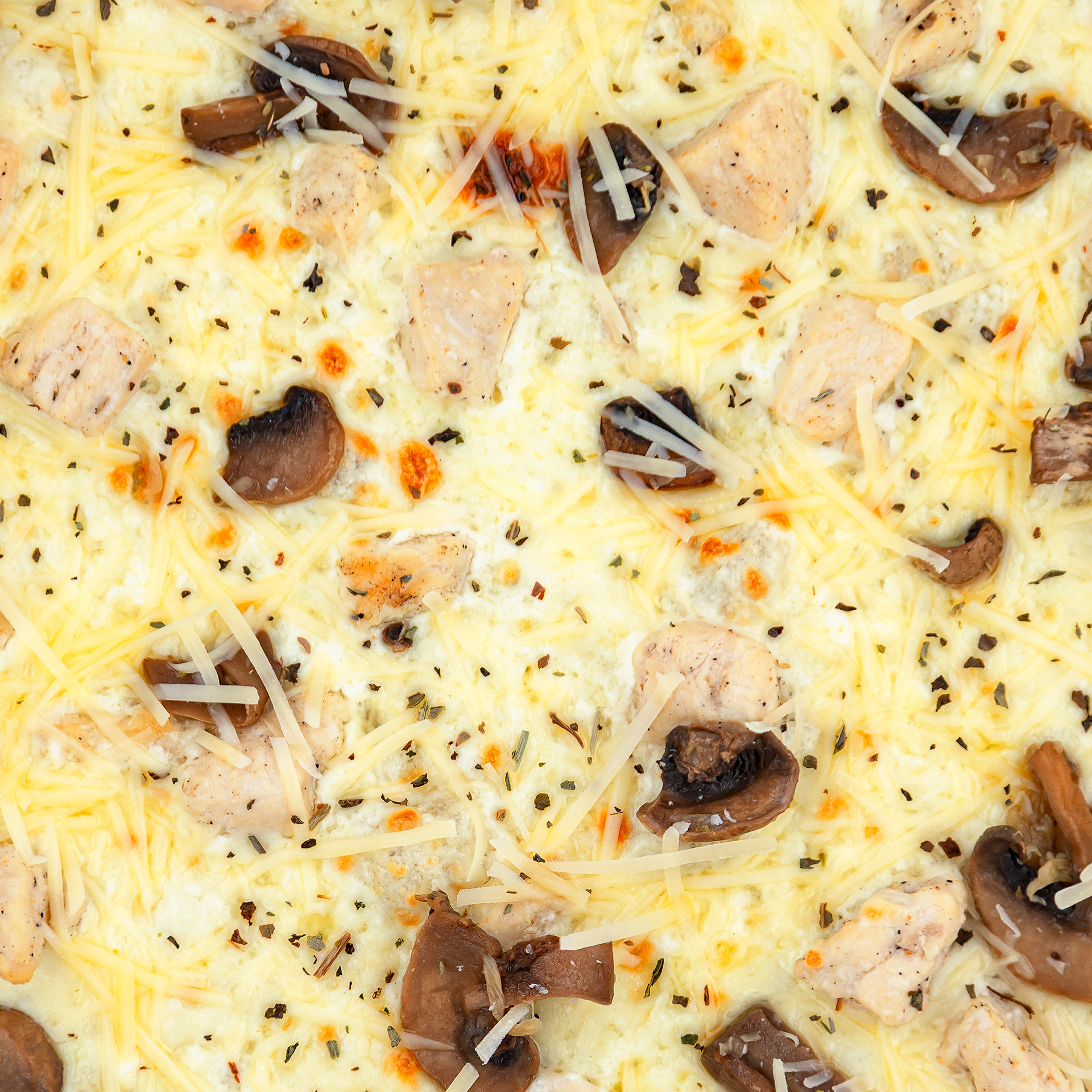 Тесто (мука, дрожжий, соль, сахар, вода, масло оливковое), сливки, моцарелла, курица, шампиньоны, пармезан, базилик.