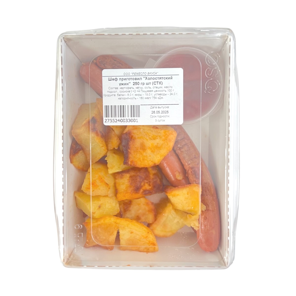 Картофель, кетчуп, соль, специи, масло подсол., сосиска. t +2 +4 Пищевая ценность 100 г продукта: белки - 8,0 г, жиры - 19,0 г, углеводы - 24,0 г, калорийность - 180 ккал/ 754 кДж.