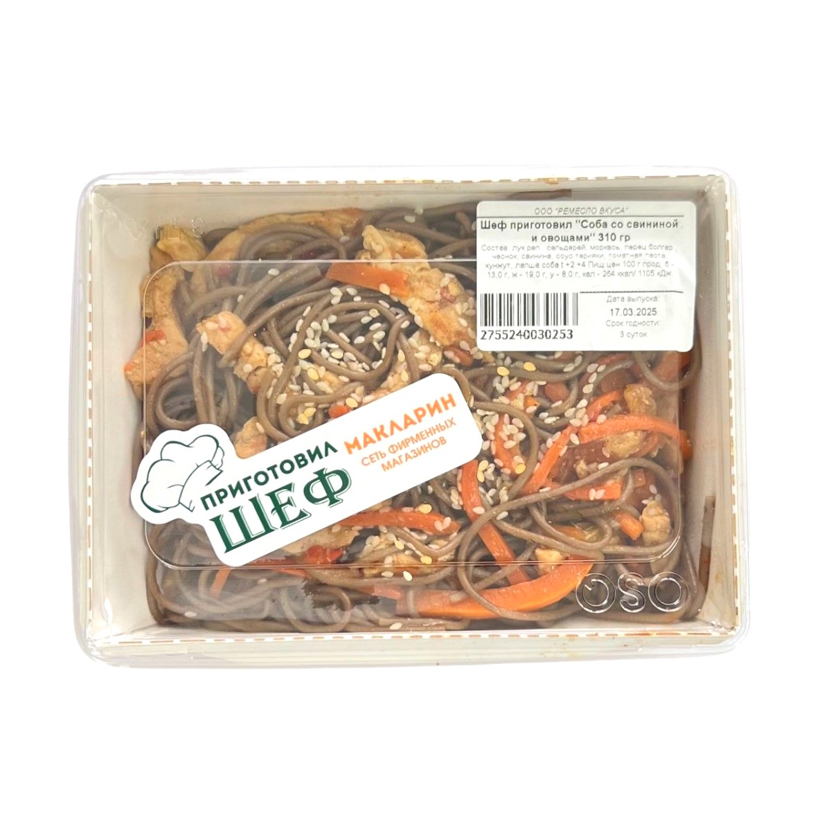 Лук репчатый, сельдерей, морквоь, перец болгарский, чеснок, свинина, соус терияки, томатная паста, кунжут, лапша соба. Условия хранения: t +2 +4.